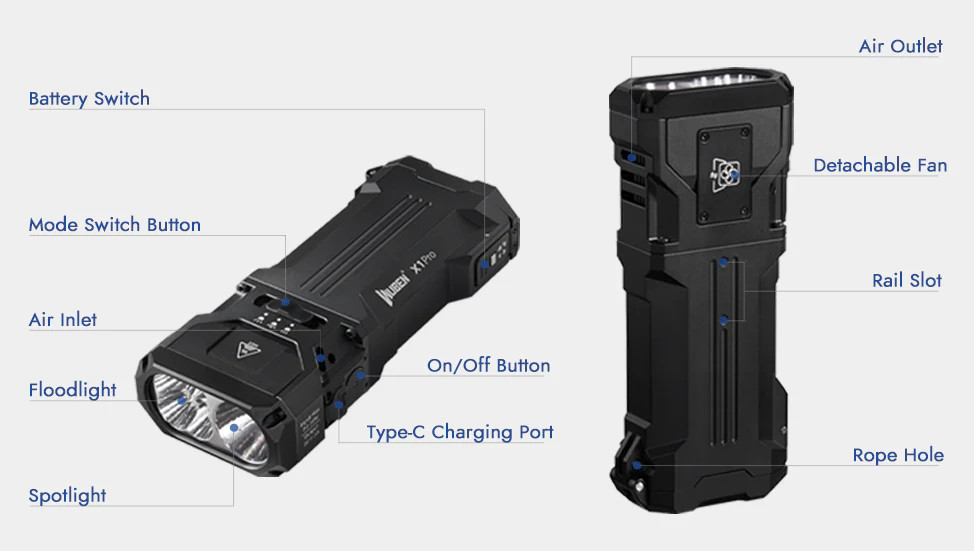 Wuben X1Pro svítilna s inteligentním systémem chlazení, 12300 lumenů, 9600mAh baterie